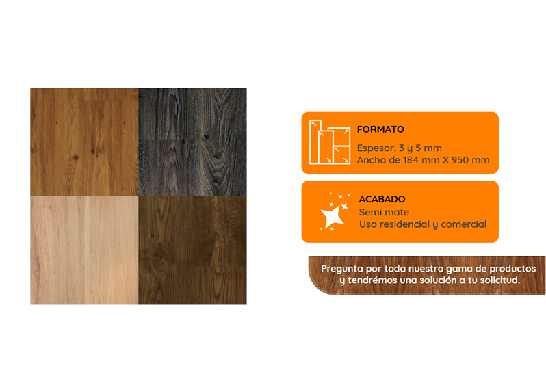 En Marmoles y maderas, sabemos que el mercado cada día es más exigente en pisos vinílicos orientados al área comercial y residencial. Los recubrimientos de viníl son productos diseñados para todo tipo de superficie. Estos pisos son fáciles de instalar, mantener y limpiar, además de facilitar la composición de diversos ambientes, gracias a su composición vinilica de fácil limpieza.